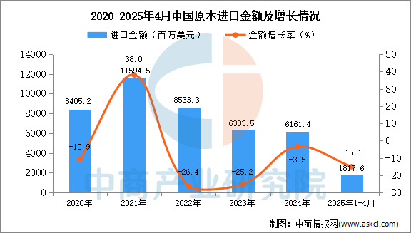 从金额方面来看,2025年1-4月中国原木进口金额1817。6百万美元,同比下降15。1%。
