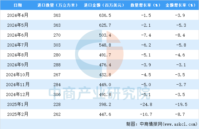 中商谍报网讯:据中商财产研究院数据库显示,2024年中国原木进口量3610万立方米,同比下降5。1%。最新数据显示,2025年1-2月中国原木进口量490万立方米,同比下降10。7%。2025年1-2月中国原木进口金额845。9百万美元。