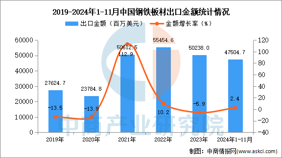 中商谍报网讯:据中商财产研究院数据库显示,2023年中国钢铁板材出口量5963万吨,最新数据显示,2024年1-11月中国钢铁板材出口量6875万吨,同比增加26。5%。